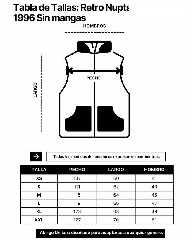 Abrigo Unisex diseñado para adaptarse a cualquier género. Revisa la tabla de tallas para elegir la medida que mejor se ajuste a ti.